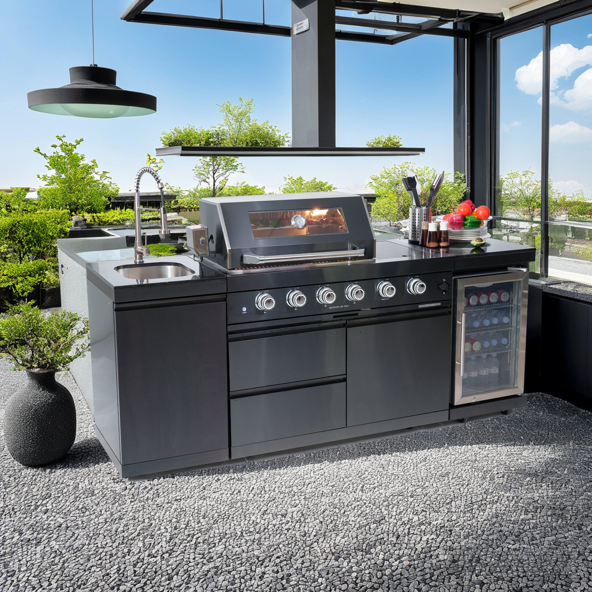 Durable black powder-coated steel provides a bold, weather-resistant frame that resists corrosion and maintains its finish season after season. The modular layout lets you configure the island to fit patios, decks, or poolside spaces while delivering ample workspace and built-in storage. The black granite countertop offers a heat-resistant, low-maintenance surface that elevates the island’s aesthetic and functionality.