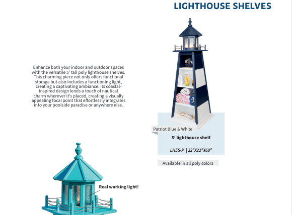 Add a bold and functional accent to your outdoor décor with our 5' Garden Lighthouse Shelf, designed to combine coastal charm with practical storage. Standing five feet tall, this eye-catching shelf is perfect for showcasing potted plants, lanterns, garden tools, or decorative accents. Crafted from durable, all-weather poly lumber, it resists fading, cracking, and rot—making it ideal for year-round outdoor use. Available in all poly color options, you can customize it to match your existing lighthouse or outdoor color scheme. Whether placed on a patio, porch, or nestled in your garden, this versatile shelf adds both beauty and utility to any space. Easy to maintain and built to last, the 5' Garden Lighthouse Shelf is a stylish solution for keeping your favorite outdoor items organized and on display.